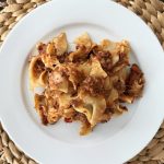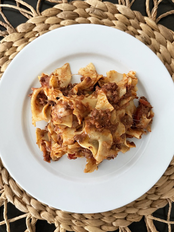 In an oven safe casserole dish add your cooked egg noodles, cover with browned butter and stir to coat the noodles, add cheese and top with the meat sauce.